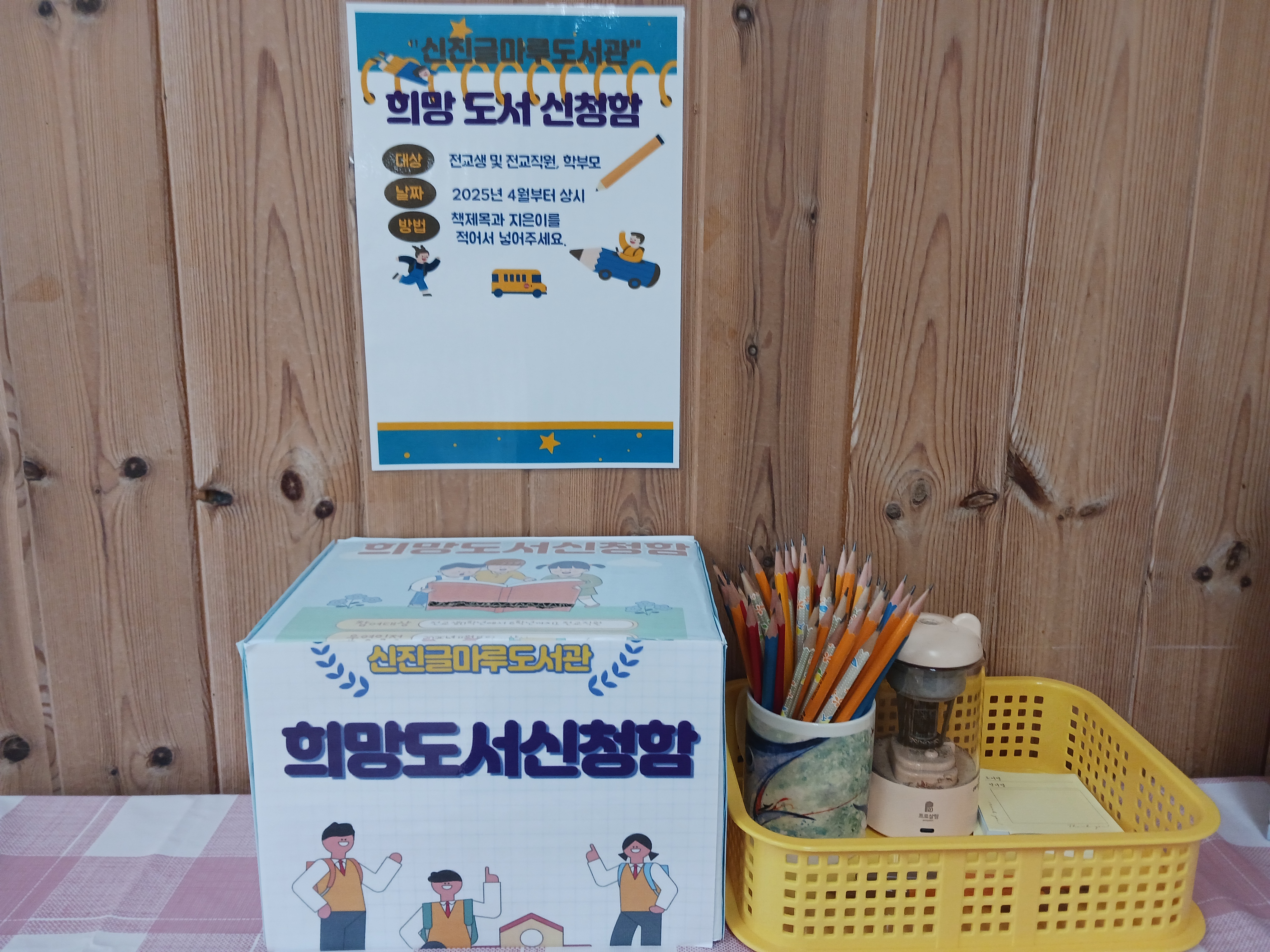 신진글마루도서관에 비치할 희망도서구입신청함에는 책제목/지은/출판사/신청자이름을 적어서 넣어주세요.