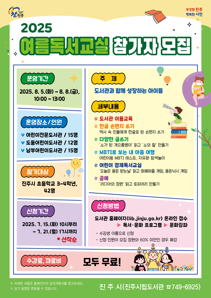 진주시립도서관 "여름방학독서교실 모집"안내